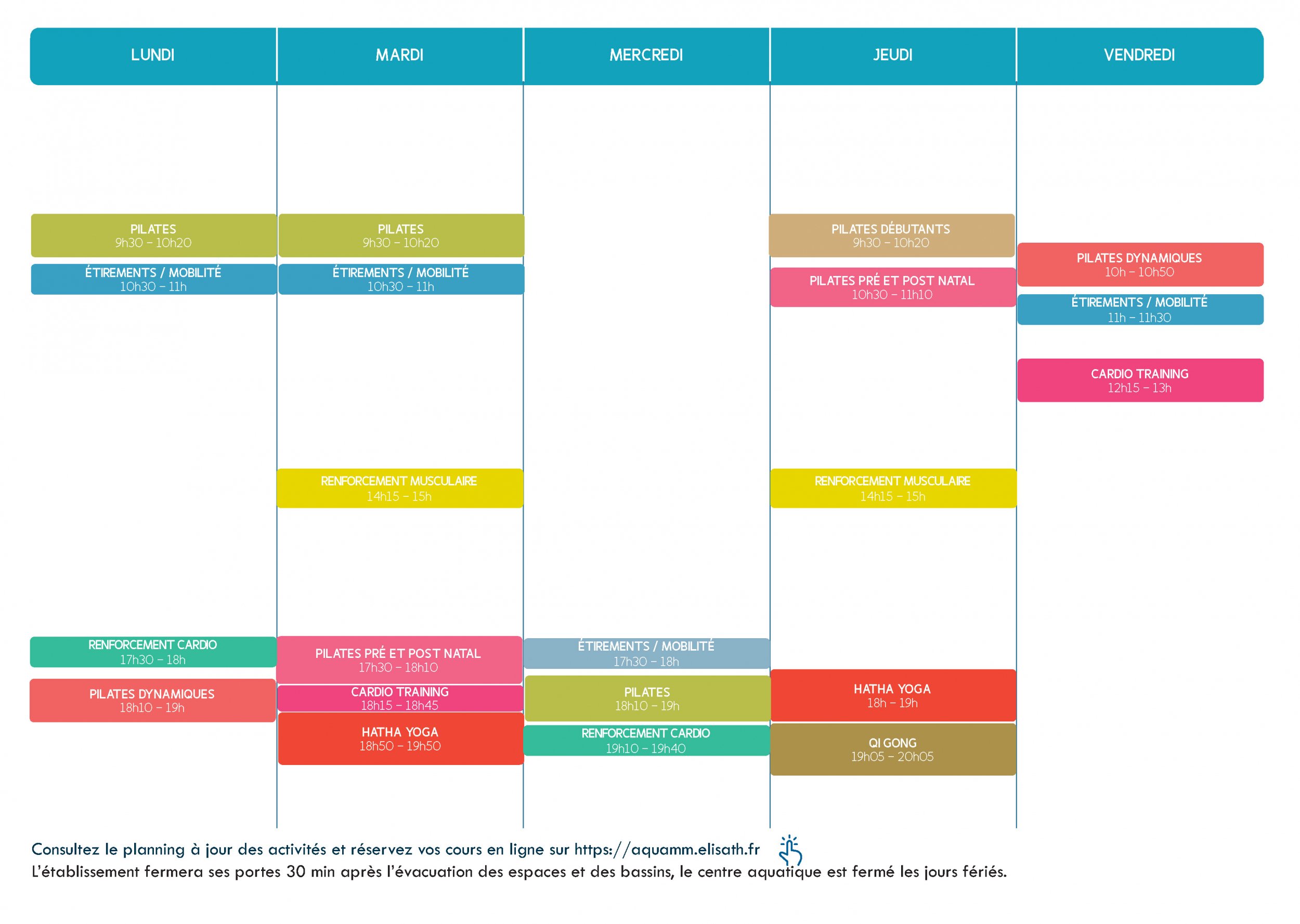 Consultez en un seul d'oeil le planning des activités de l'espace aquatique et de l'espace forme